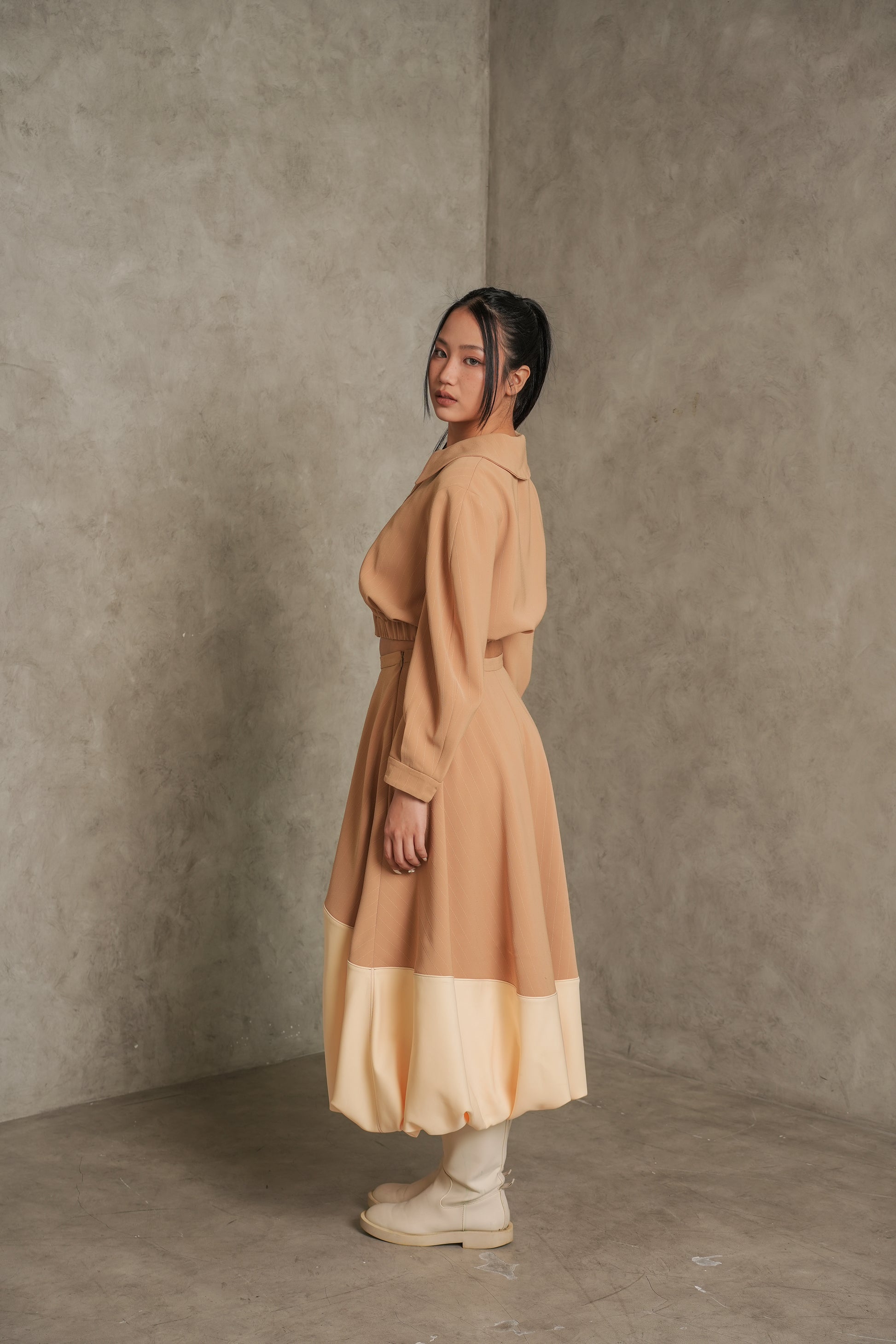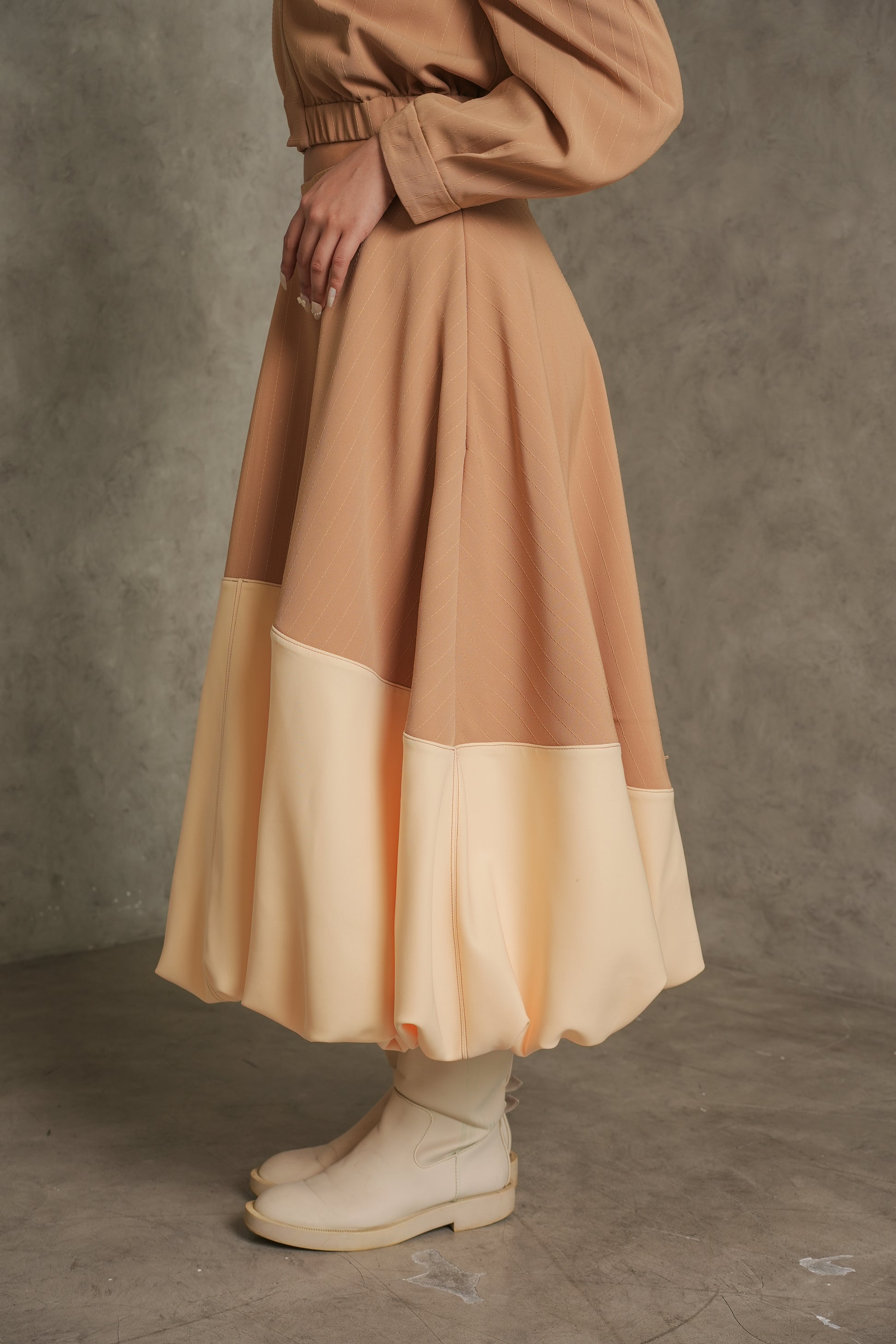 Elegant skirt with a two-tone design and unique soft puffed bottom.