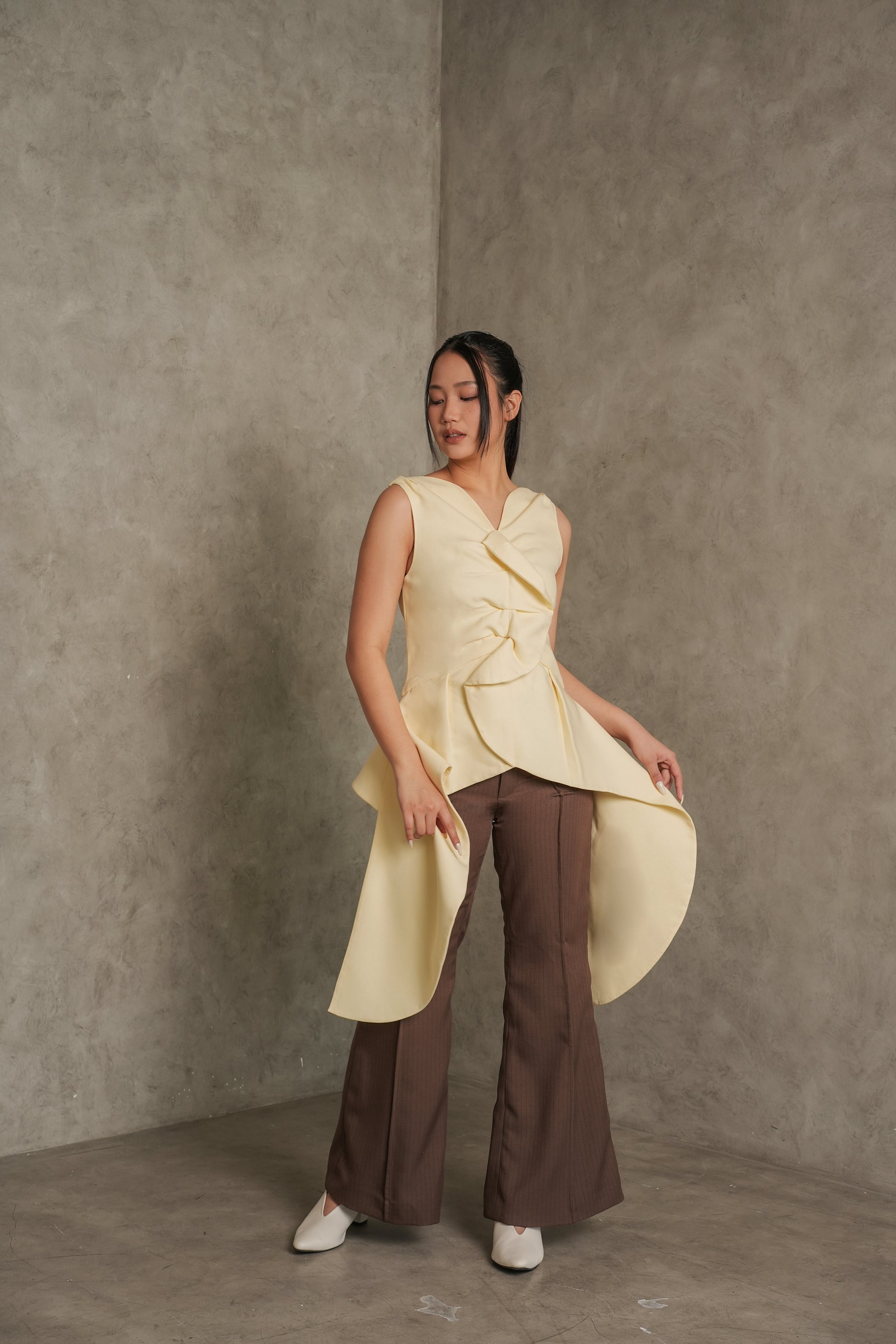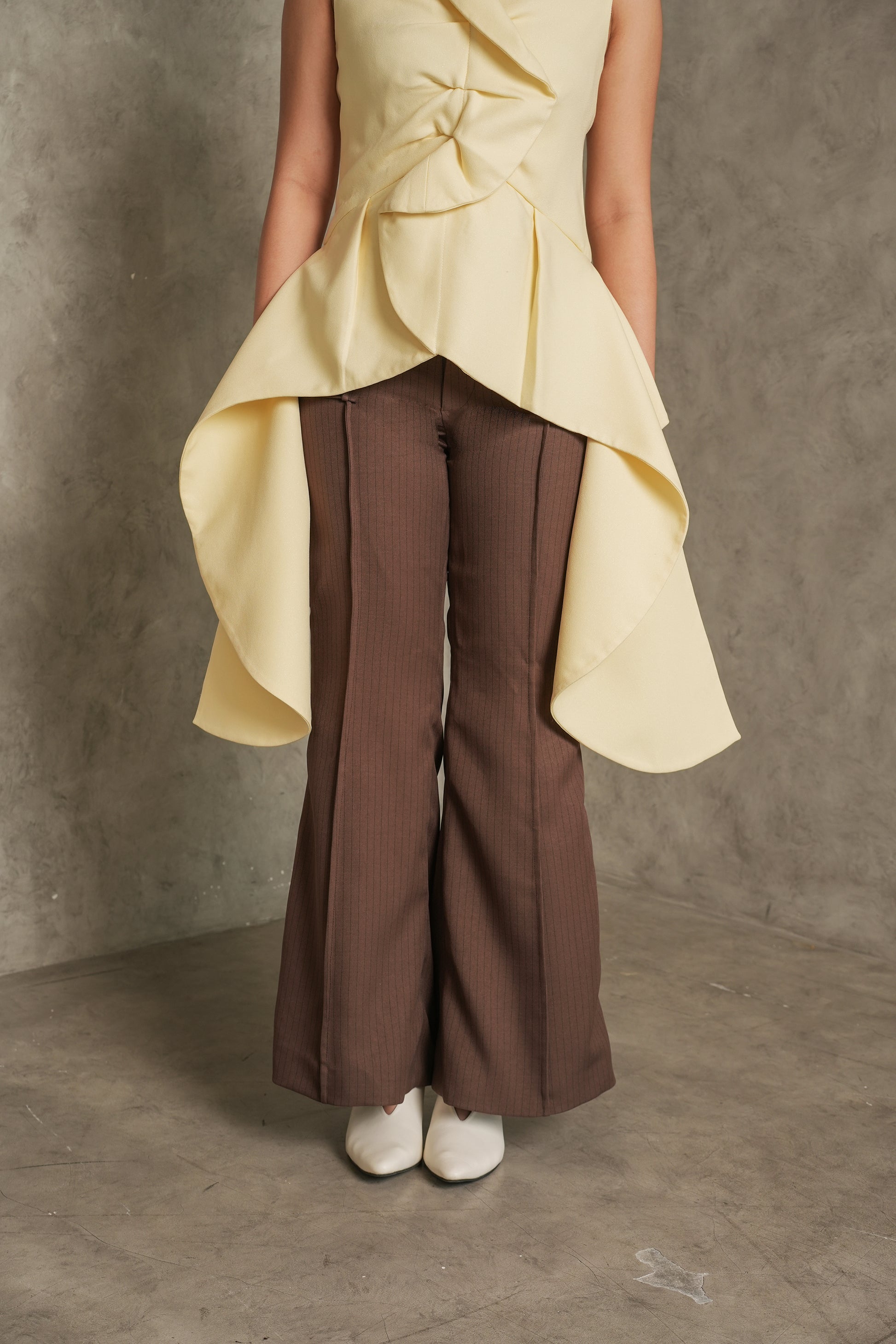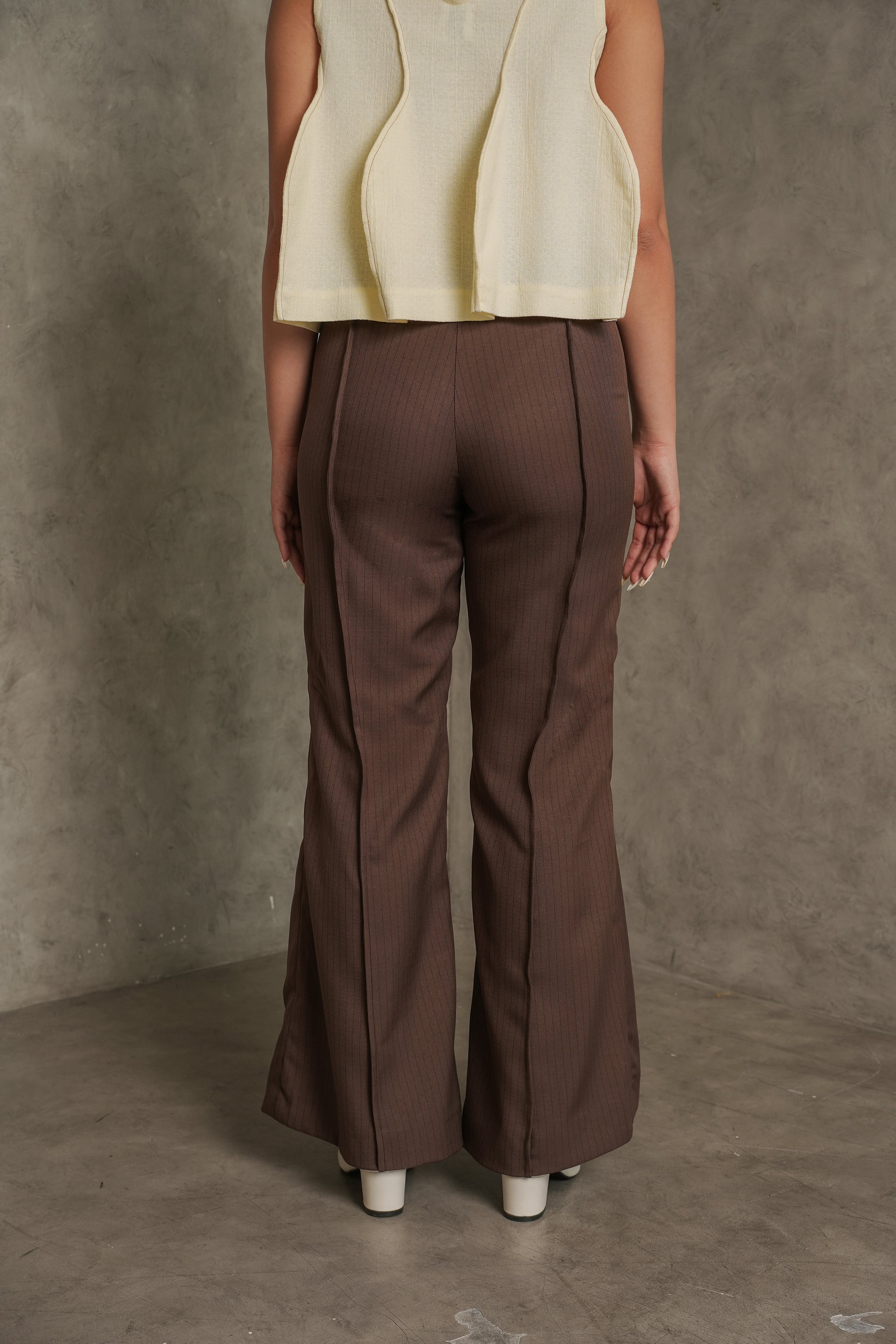 Brown flared pants with a high waist and soft stripes, perfect for a stylish everyday look